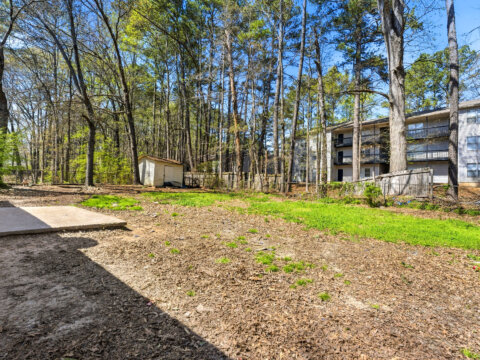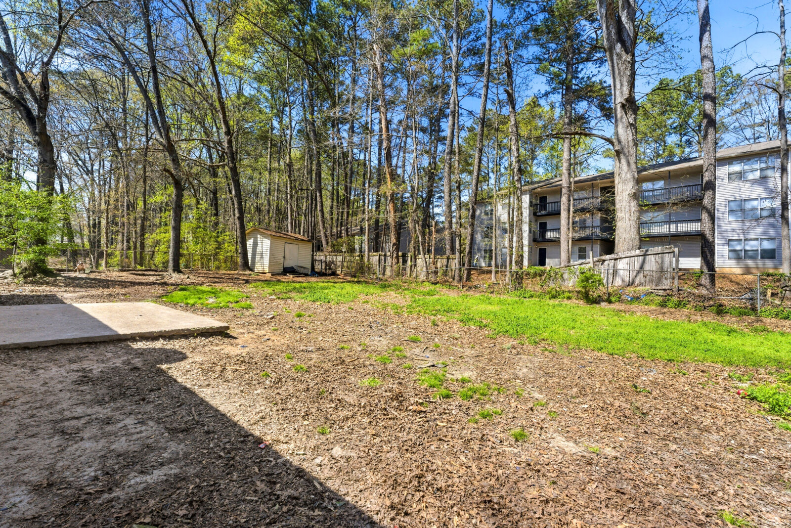 Level Quarter-Acre Lot — Approx. 0.25 acres featuring a masonry patio and a storage shed.